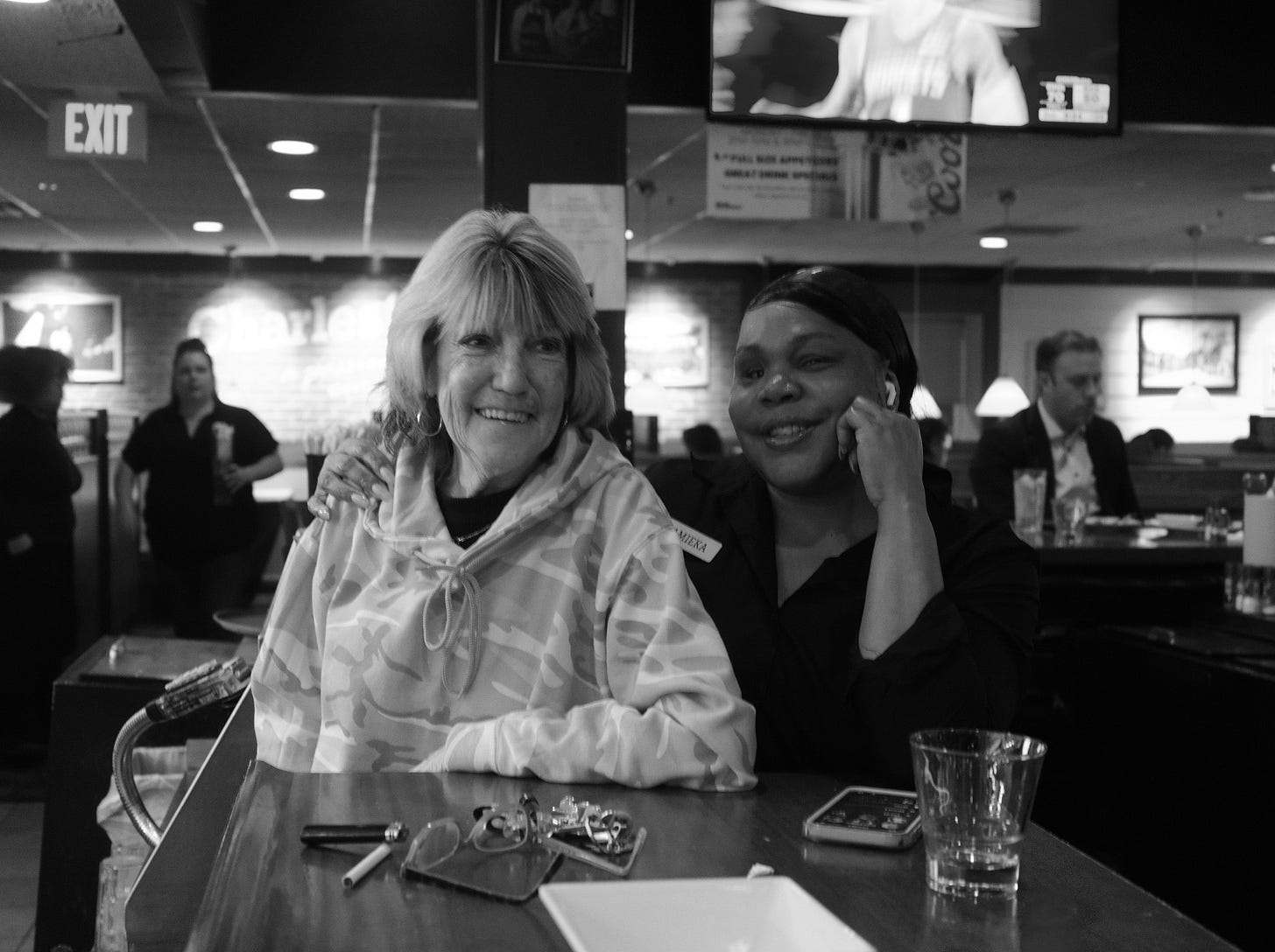 She moves around the bar like someone who’s been on your team for a long time. She looks like she should be in her forties. She’s actually 53, with four kids and three grandkids. Two small tattoos, one on each cheek.